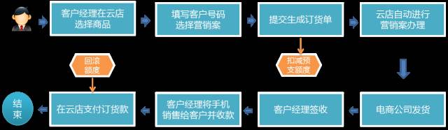 云店針對全省統一政策及各地市屬地化營銷政策開設全省專區及地市專區,對各地市上報客戶經理號碼進行專區預埋并賦予客戶經理一定信用額度用來預支付貨款。客戶經理在向客戶作產品營銷時,打開云店APP,進入相應專區向客戶推薦機型政策,客戶達成購買意愿后為客戶在線選擇相應營銷政策并在線下單,用信用額度預支付購機款,隨后云店自動辦理相應營銷案,訂單推送至就近倉庫,倉庫配串,物流配送,客戶經理簽收后將終端售給客戶并收取相應貨款,在云店支付訂貨款后信用額度回滾。