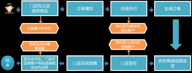 門店申請入駐云店后可在門店專區查看意向商品,若達成進貨意向,則在線下單進貨并在線支付貨款,待供貨商發貨,門店簽收后,門店前期所支付貨款分潤至供貨商賬戶,待門店完成銷售后,可通過云店APP回傳合約號碼,為客戶辦理相應合約政策。