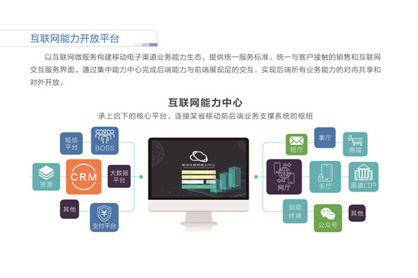 互聯(lián)網(wǎng)能力開放平臺,以互聯(lián)網(wǎng)微服務(wù)構(gòu)建移動電子渠道業(yè)務(wù)能力生態(tài),提供統(tǒng)一服務(wù)標準、統(tǒng)一與客戶接觸的銷售和互聯(lián)網(wǎng)交互服務(wù)界面。通過集中能力中心完成后端能力與前端展現(xiàn)層的交互,實現(xiàn)后端所有業(yè)務(wù)能力的對內(nèi)共享和對外開放。
